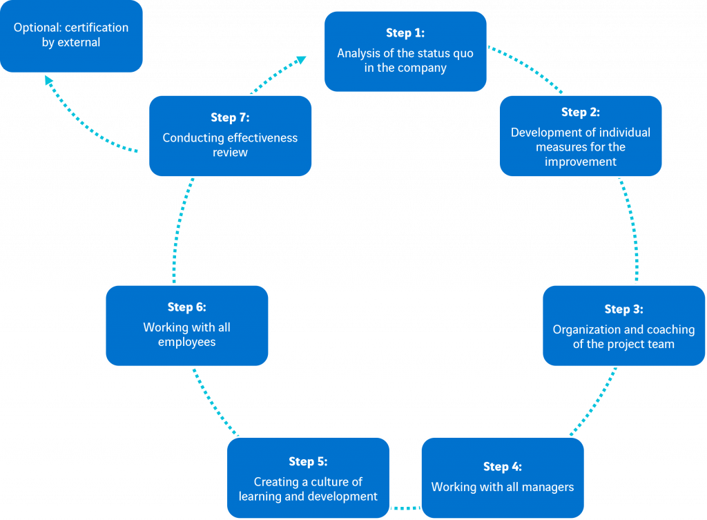 Whereby each step is adapted to the size of the company, the goals and the current awareness and behavior of the employees.